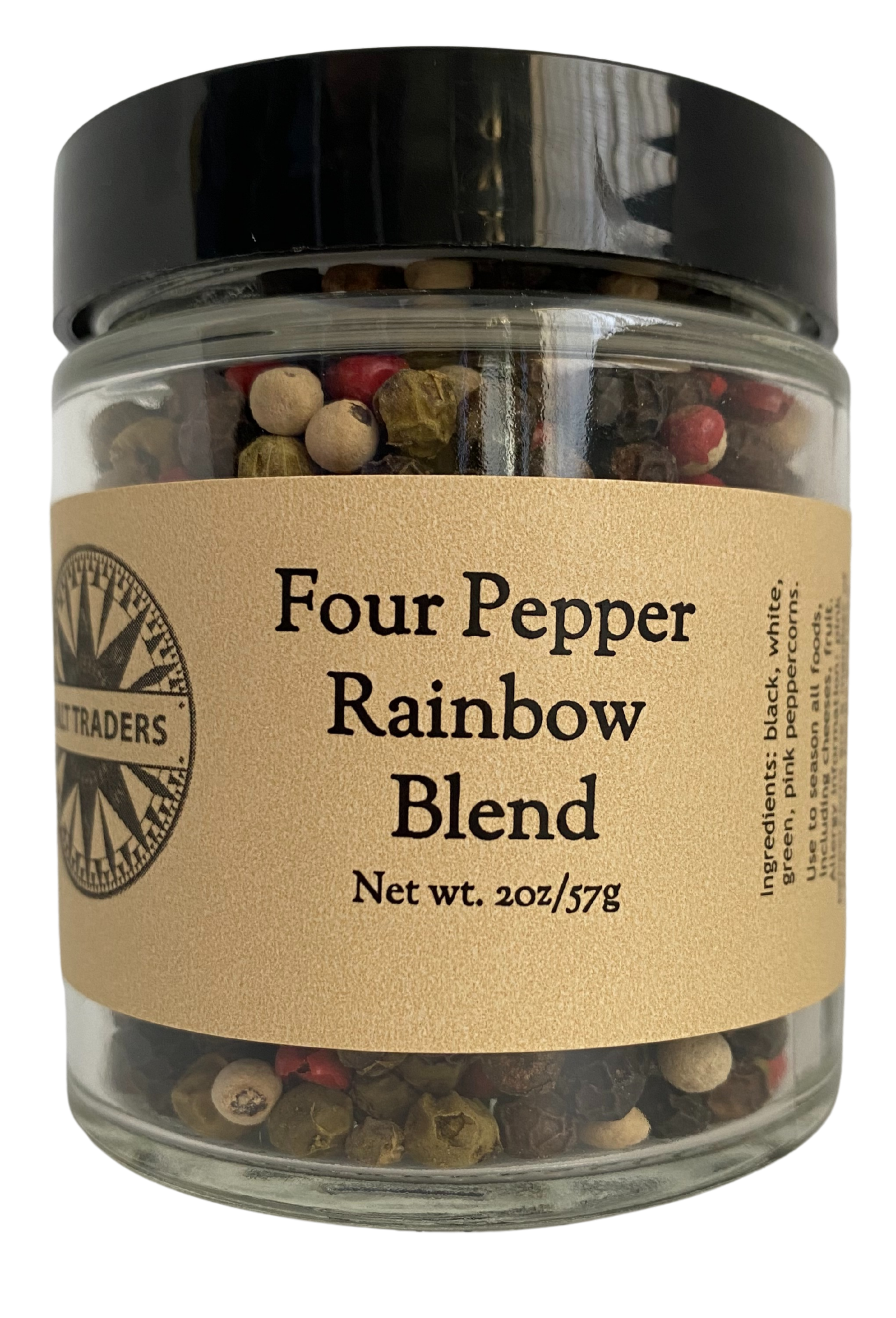 Four Pepper Blend is a delicately balanced mix of black, white, pink, and green peppercorns. The pungent bite of the black and white peppercorns are touched with a bit of sweetness from the pink peppercorns and a crisp tang from the green peppercorns. Well-rounded and full of subtle flavors.
