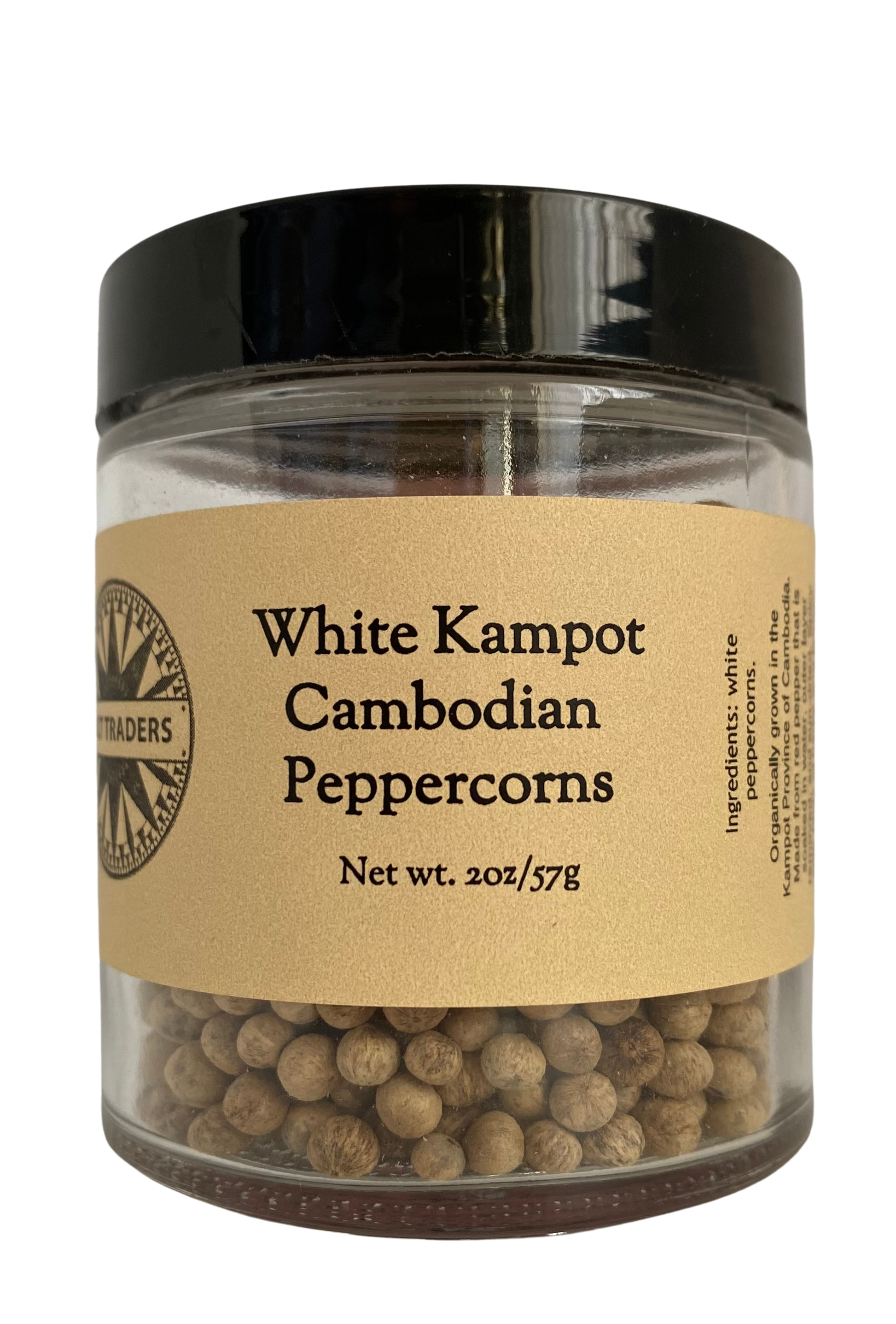 Organic and Fair Trade Kampot White Peppercorns are traditionally grown and hand-harvested. The peppercorns are picked when fully ripe and are washed, blanched, then left in water overnight. The outer skin is then removed. The inner seed is washed and sun-dried for several days. Very spicy with hints of herbs and citrus and very soft aromas of eucalyptus and lemon.