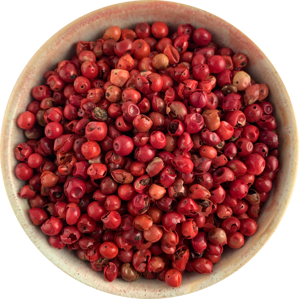 Pink Peppercorns are dried berrires of the shrub, Schinus terebinthifolius, native to South America. They are not true peppercorns, but are called such simply because they resemble a peppercorn and have a peppery aspect to their flavor. When dried, they have a fruity-tart, yet sweet, aromatic, peppery flavor that is unique.